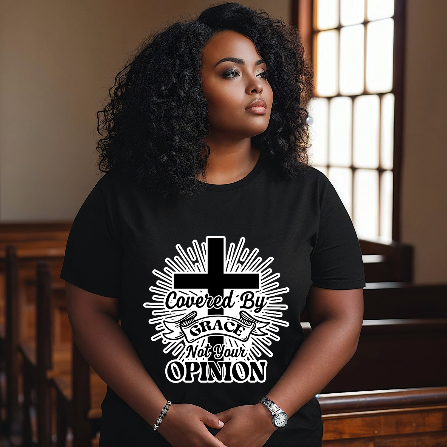 Covered by Grace, not your opinion Tshirt. Because God's Favor speaks Louder than anyone else's voice.